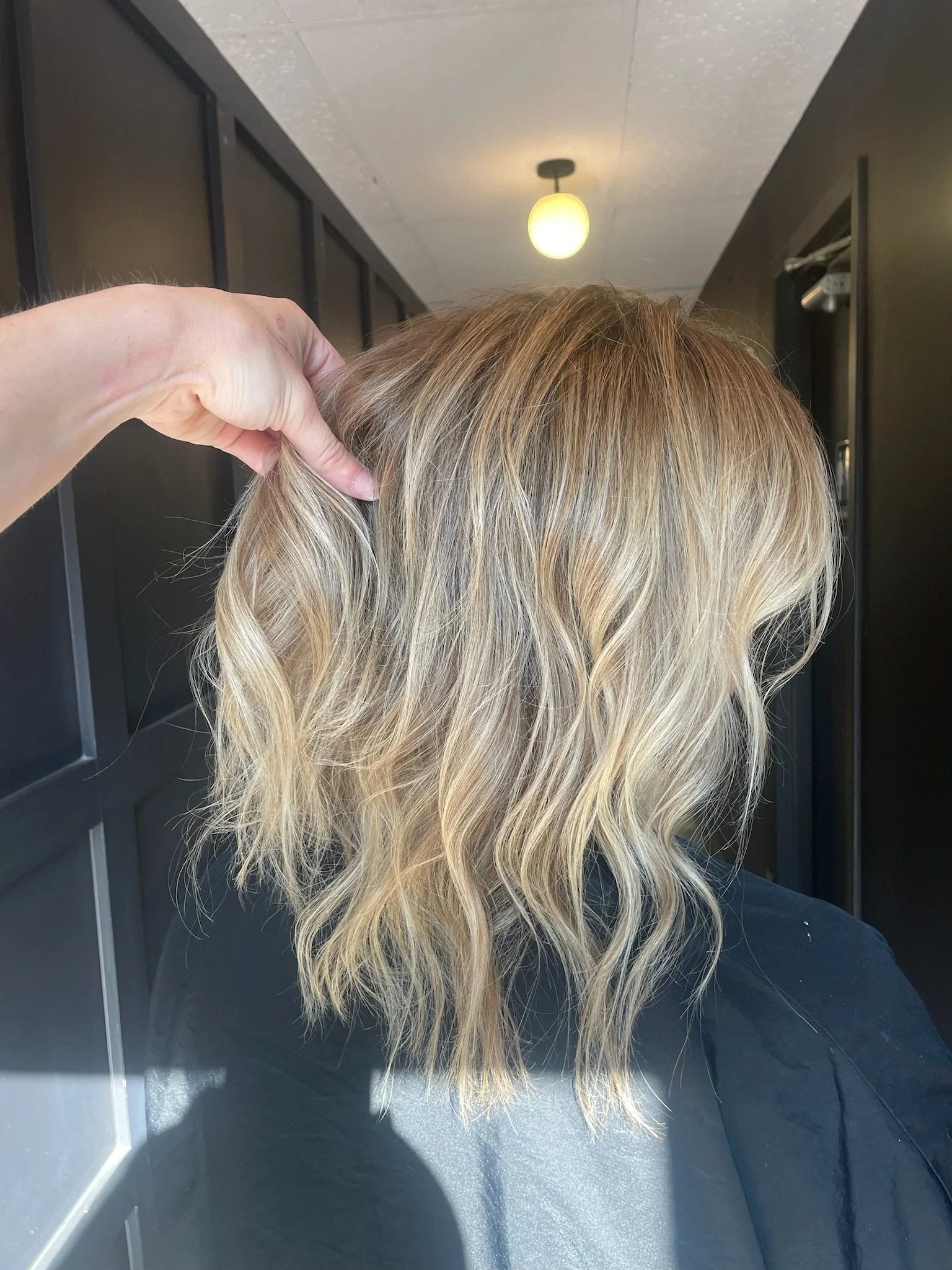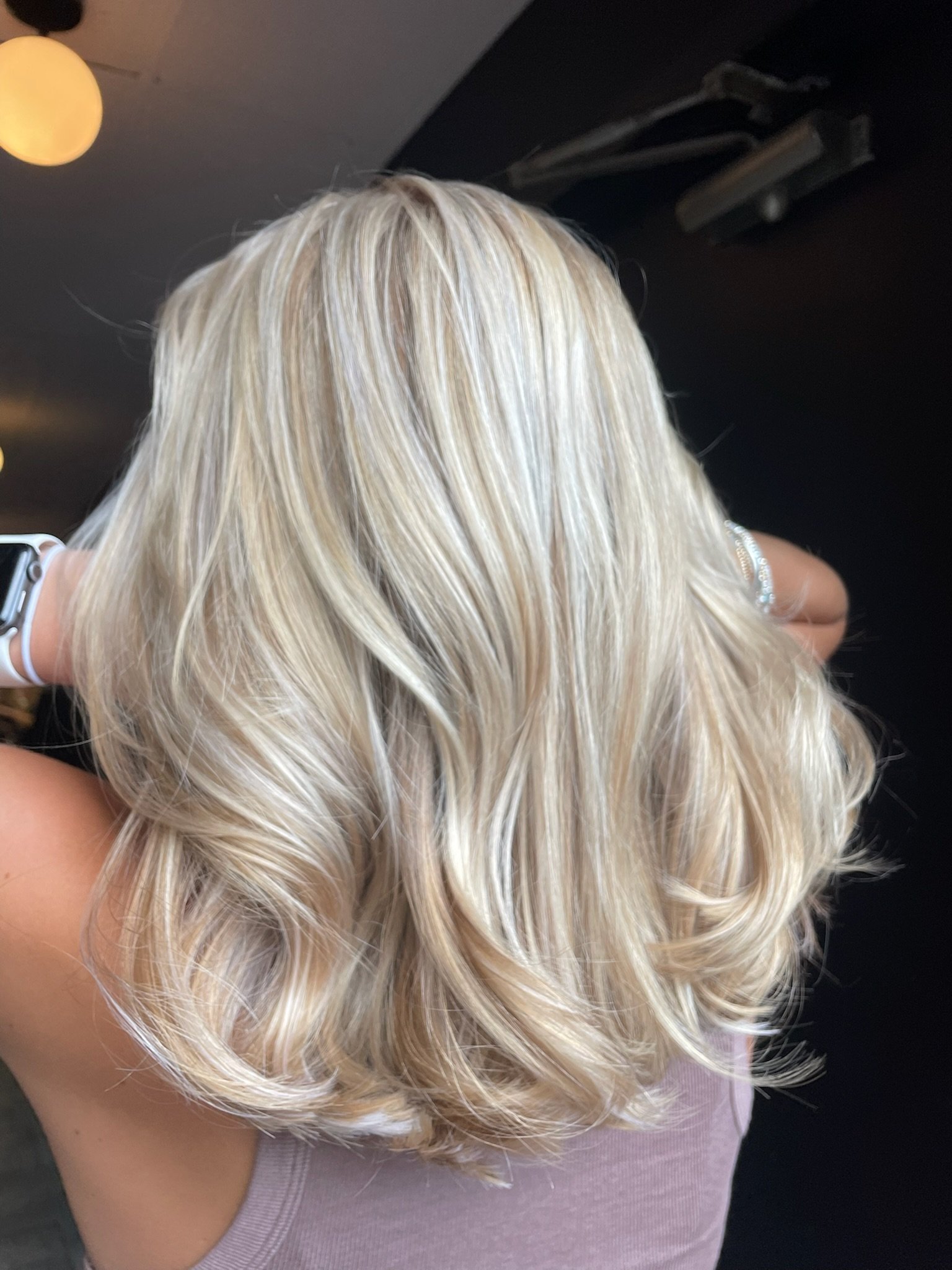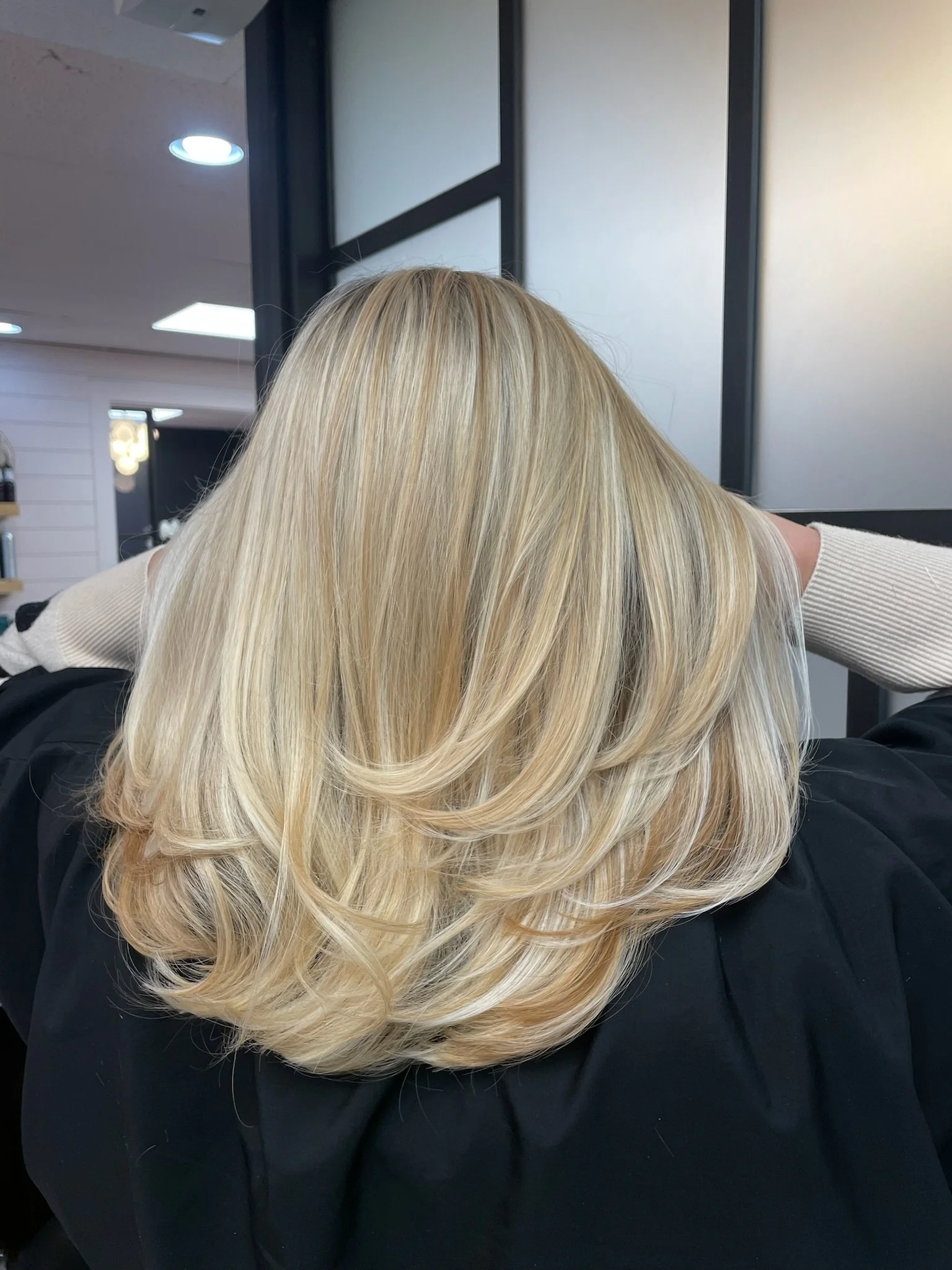 Expertly placed highlights that add depth, light, and subtle contrast to your hair, creating a luminous, multi-dimensional effect. This personalized service enhances your natural color with a soft, sun-kissed glow for timeless elegance. -